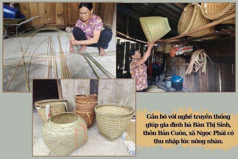 Bắt đầu biết đan lát khi còn là cô thiếu nữ 12 - 13 tuổi, đến nay đã có 50 năm trong nghề, nhịp nhàng tay bắt nan trúc, bà Bàn Thị Sỉnh ở thôn Bản Cuôn, xã Ngọc Phái cho biết: "Hồi nhỏ, ngồi nhìn cha làm rồi bắt chước theo, tôi dần biết đan các vật dụng từ đơn giản đến phức tạp như: Rổ, rá, sọt đựng cá, gùi đựng lúa, ngô... Trong đó có chiếc gùi là vật dụng không thể thiếu trong cuộc sống hằng ngày của người Dao Đỏ. Một chiếc gùi phải đan trong vòng 2 - 3 ngày, tùy kích cỡ, bán được giá từ 200.000 - 300.000 đồng. Mỗi năm, tôi làm được khoảng 30 - 40 sản phẩm, vừa để gia đình sử dụng vừa tạo thu nhập lúc nông nhàn".