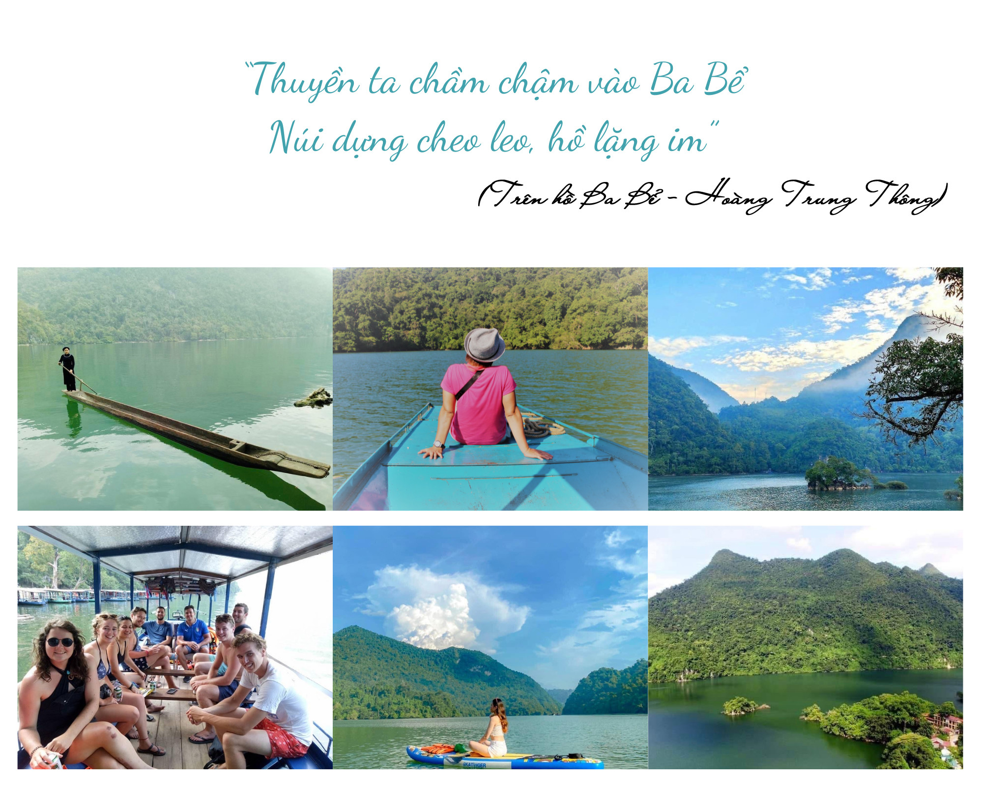 Hồ Ba Bể như một chiếc gương khổng lồ soi bóng non xanh. Để chiêm ngưỡng vẻ đẹp của hồ, du khách sẽ du ngoạn trên xuồng máy, hoặc trải nghiệm kỳ thú bằng cách chèo thuyền kayak. Giữa mênh mông sông nước, bốn bề núi non bao phủ, lắng nghe sự tích về hồ Ba Bể, đắm mình trong làn điệu hát Then, đàn Tính của những cô gái Tày mộc mạc, chắc chắn sẽ là một trải nghiệm thú vị.