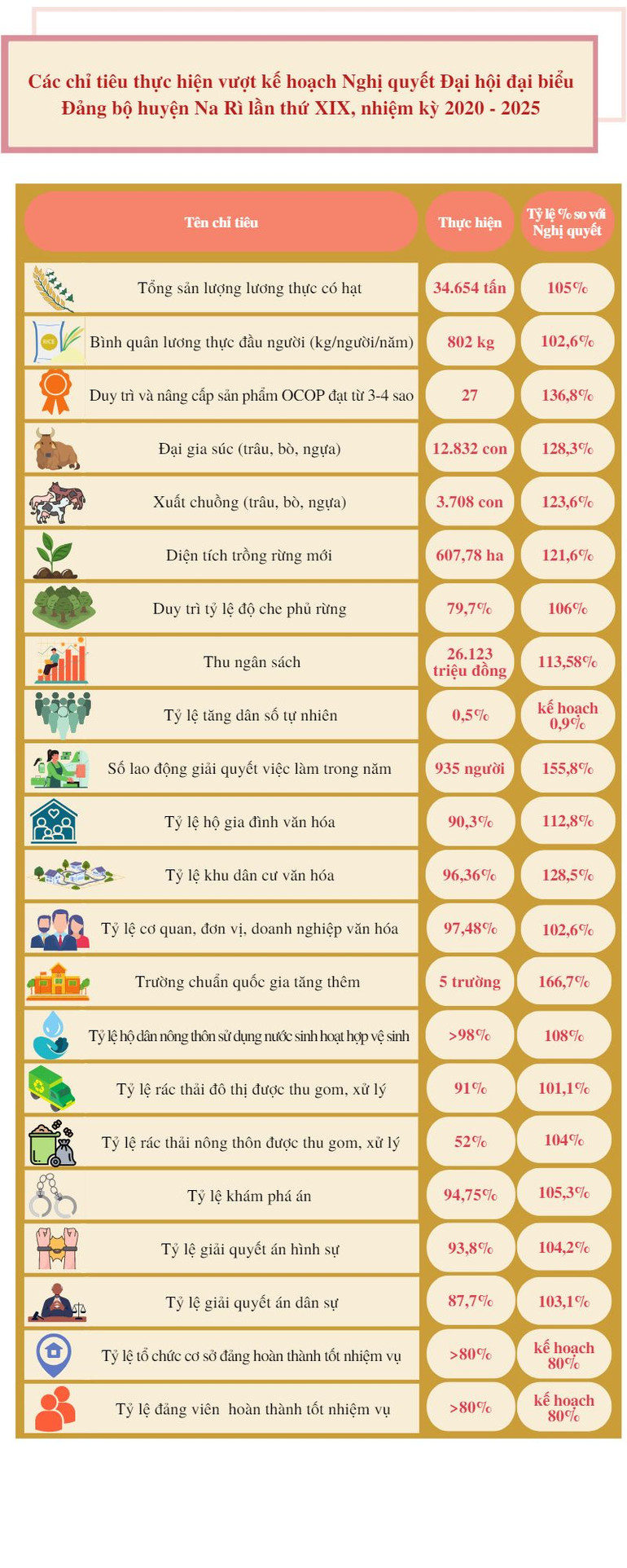 Trong 50 mục tiêu chủ yếu đề ra đầu nhiệm kỳ, đến nay huyện có 37/50 mục tiêu đạt và vượt so với Nghị quyết Đại hội, 13/50 mục tiêu chưa đạt chủ yếu là các mục tiêu phấn đấu đạt đến cuối nhiệm kỳ.