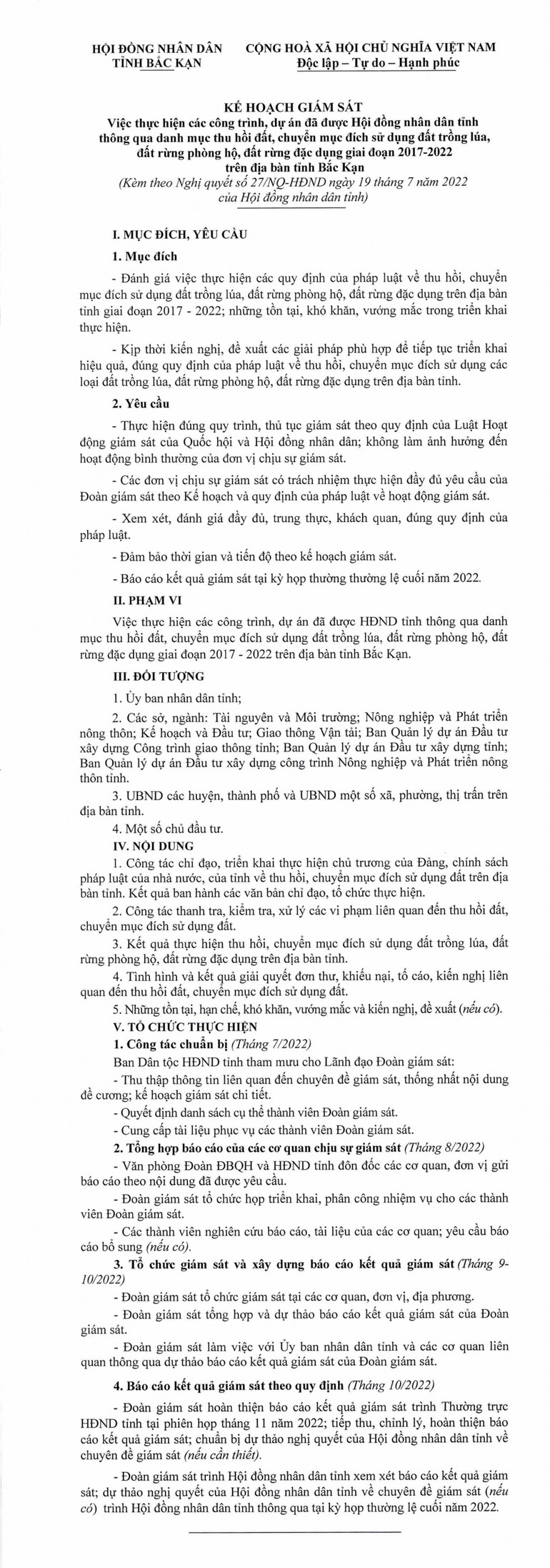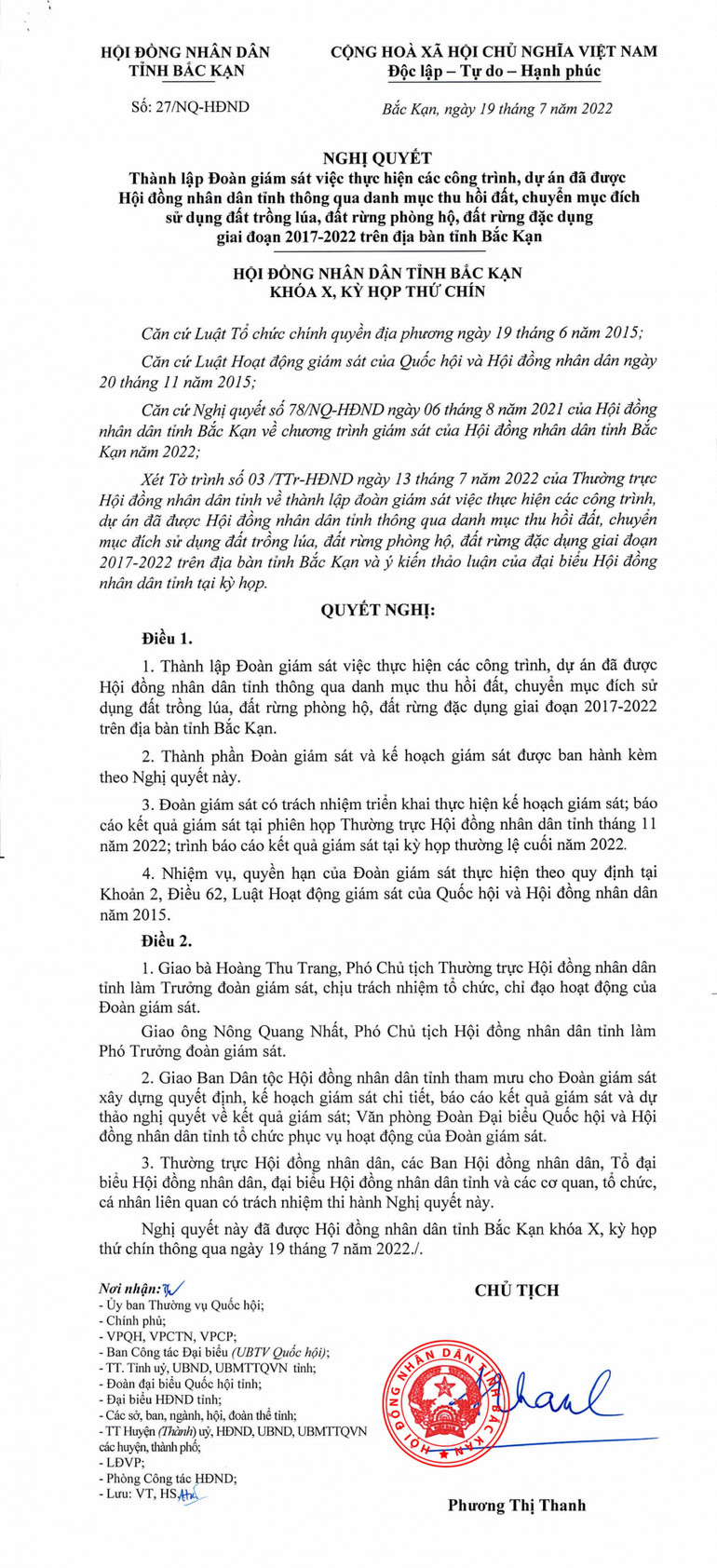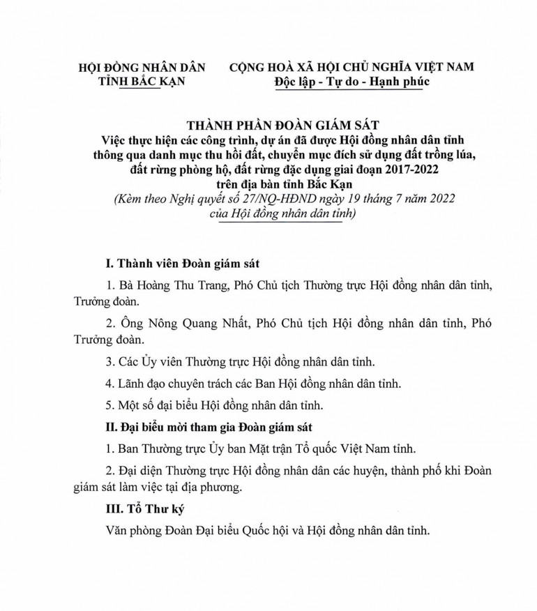 Nghị quyết thành lập Đoàn giám sát việc thực hiện các công trình, dự án đã được Hội đồng nhân dân tỉnh thông qua danh mục thu hồi đất, chuyển mục đích sử dụng đất trồng lúa, đất rừng phòng hộ, đất rừng đặc dụng giai đoạn 2017 - 2022 trên địa bàn tỉnh Bắc